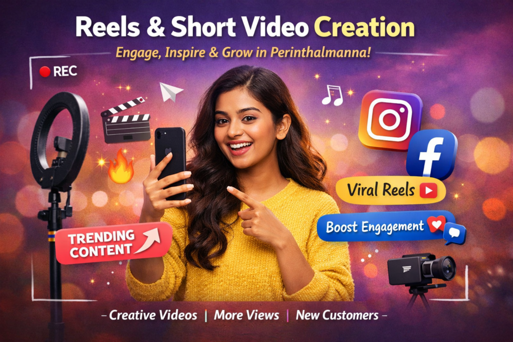 focuses on producing engaging, high-quality short-form videos that capture attention quickly and boost audience interaction. In a fast-growing digital space like Perinthalmanna, reels and short videos help businesses showcase their products, services, and brand personality in a creative and impactful way. With the right mix of trending content, storytelling, and visual appeal, businesses can increase reach, improve engagement, and attract more potential customers through platforms like Instagram and Facebook.