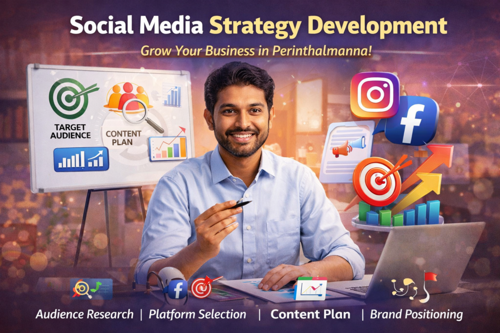 Social Media Strategy Development is the process of planning and organizing your brand’s online presence to achieve clear business goals. In a competitive market like Perinthalmanna, it involves identifying your target audience, selecting the right platforms, and creating a consistent content plan that reflects your brand voice. A well-defined strategy helps businesses increase engagement, build trust, and drive measurable growth through effective and focused social media efforts.